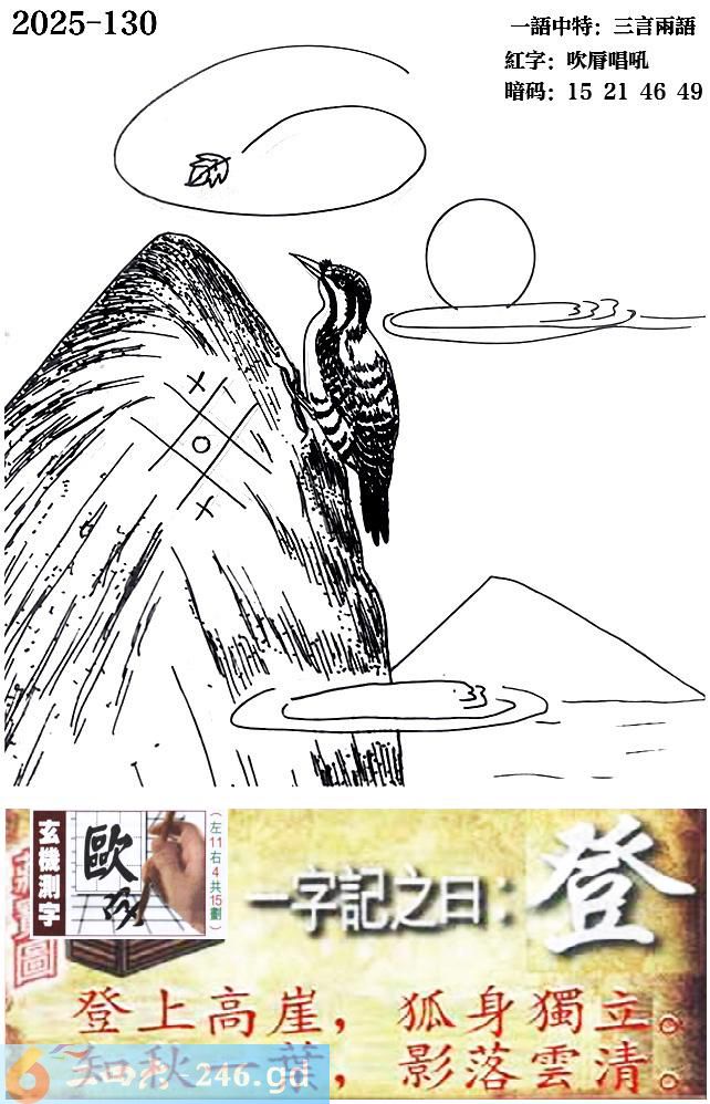 130期跑狗一字記之曰:【登】 登上高崖,狐身獨立。 知秋壹葉,影落雲清。 玄機測字:《歐》 一語中特:三言兩語