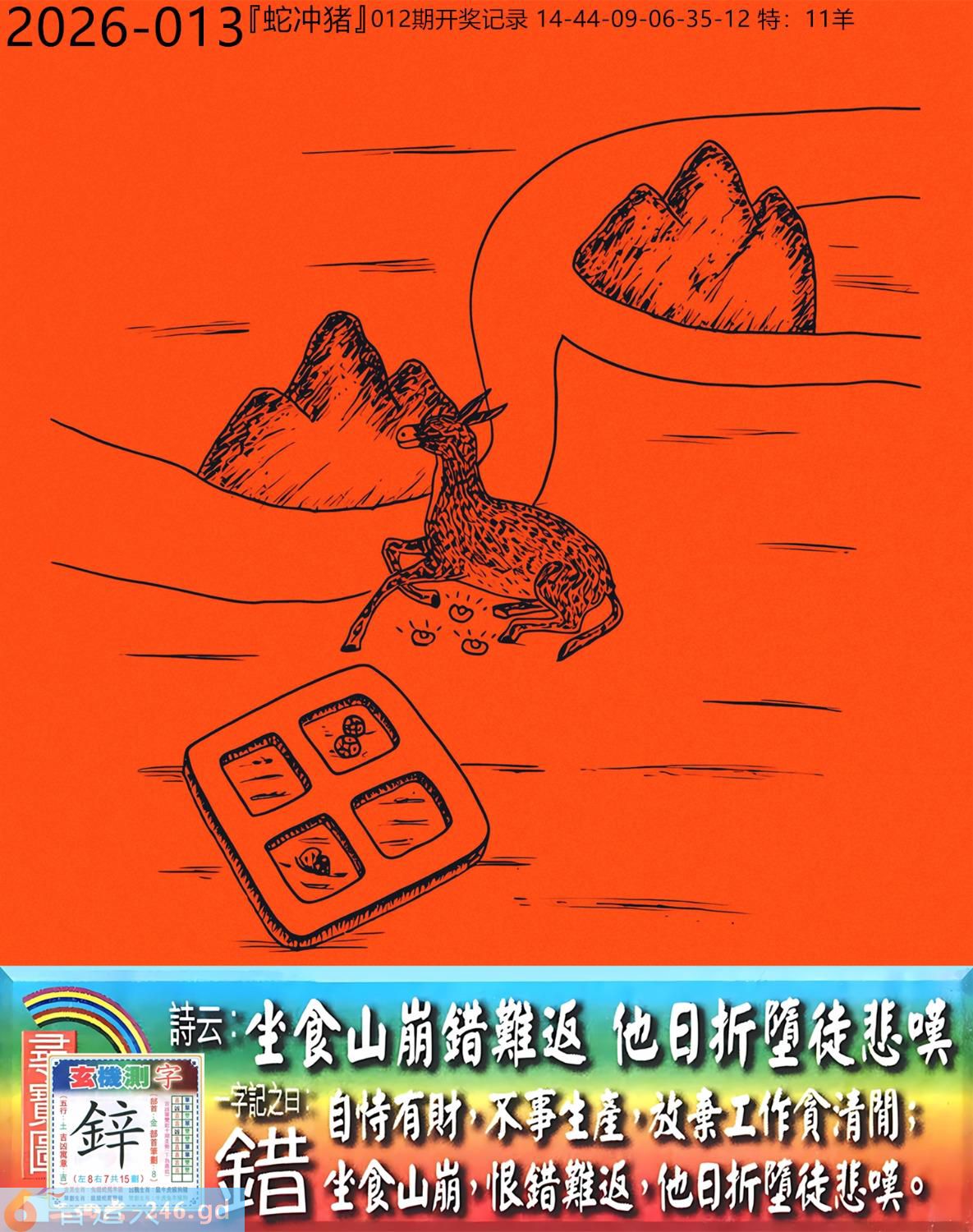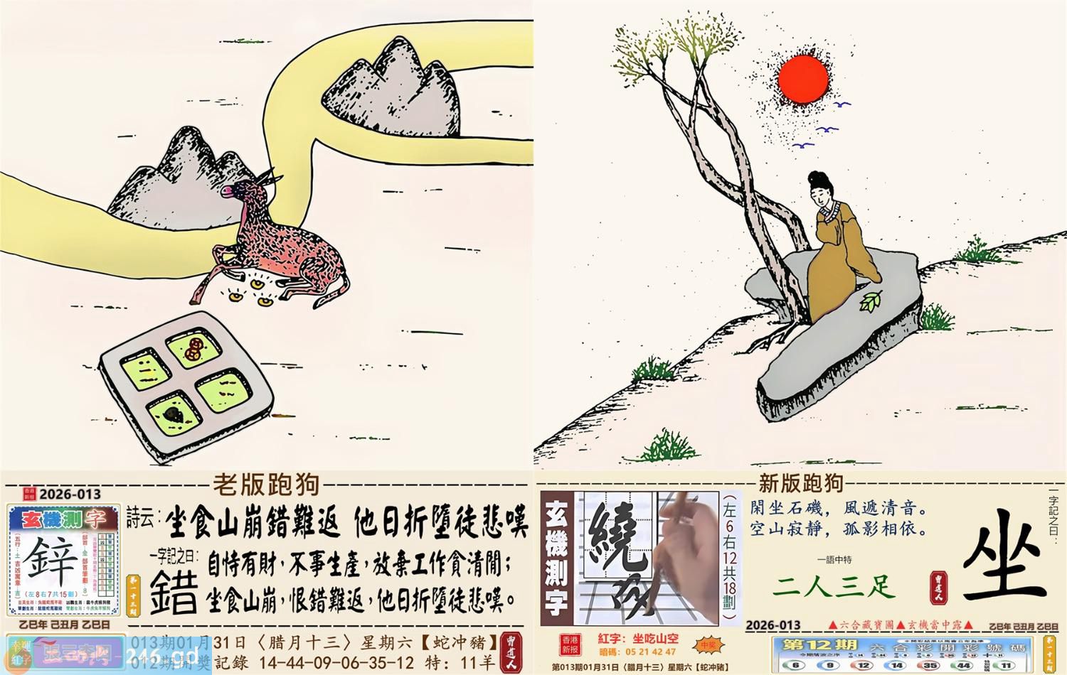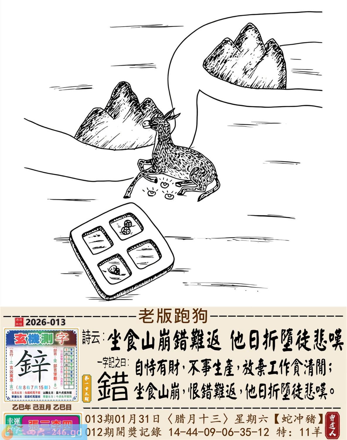 2026年1月31日013期(猪(己亥)(覆灯火) 013期:老版跑狗玄機一字記之曰:【錯】 詩云:坐食山崩錯難返他日折墮徒悲嘆 自恃有財,不事生產,放棄工作貪清閒; 坐食山崩,恨錯難返,他日折墮徒悲嘆。 玄機測字:《鋅》 密圖詩:英雄難過美人關 《記》:一個早上跑五圈 特碼大小單雙句:四鄉八里先后 今期必中:大喬 013期:特碼歇后語 钻子遇到锉子-----死对头 013期正版四字梅花诗:酒绿灯红。 013期火车头:烧伤狗。诗:马死牛伤,一蛇延愿十里长。 013期香港第一手欲钱料:马? 013期曾道人说:“三楼” 013期另版四字梅花诗:三百六十。 013期香港第一手欲钱料:欲钱看狗是怎么跑的。 013期曾道人说:“为什么地球是在转的”? 013期:二字經:今期 013期:鸡蛋是特码 013期:智力金壤;甜言蜜语 013期:信箱紅字:【坐吃山空】 013期:【暗碼:05-21-42-47】 013期:一語中特:【二人三足】 發財玄機圖:防患未然斜目睨視圖中明龍蛇藍綠 013期:藏寳圖 新:遥知贼胆纵横破 老:锦树摧残胡蝶老 禁:鼠禁:0尾玄机字《虚》 2026年013期【生活幽默】版 〖小偷〗 一小偷偷了個錢包,不久後落網。 在派出所他看到受害者, 小偷:"大哥,你錢包裏明明衹有2000塊,你怎磨説被偷了5000塊?後果很嚴重的!" 受害者:"兄弟,幫哥個忙,上個月我多花了3000,没法给媳姆報賬,正好你把我錢包偷了,這不......" 小偷噗通跪地:"大哥,我媳婦比你媳婦狠多 了,如果她以爲我偷了5000塊,衹上交2000,她會把我弄死不可,大哥,都是男人,你發發慈悲吧!"