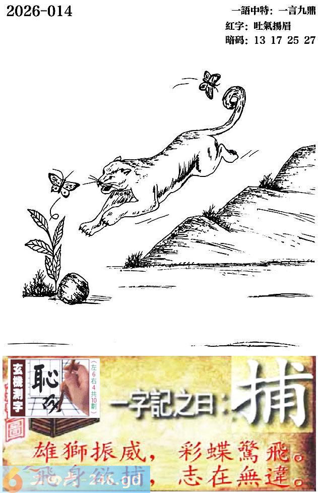 014期跑狗一字記之曰:【捕】 雄獅振威,彩蝶驚飛。 飛身欲捕,誌在無違。 玄機測字:《恥》 一語中特:一言九鼎