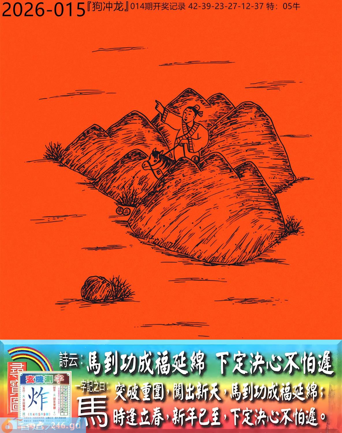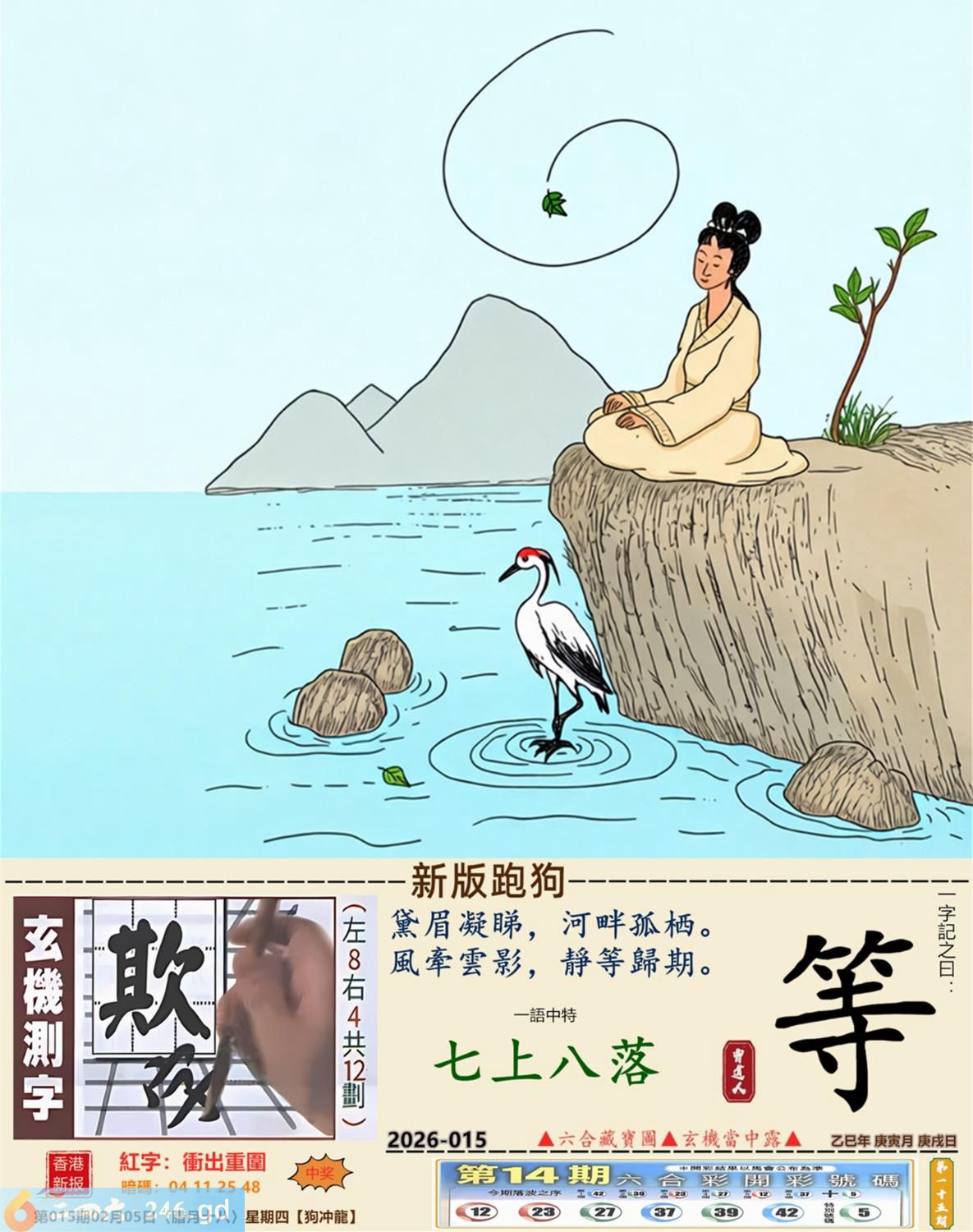 2026年2月5日015期龙(甲辰)(钗钏金) 015期:老版跑狗玄機一字記之曰:【馬】 詩云:馬到成功福延綿下定決心不怕遲 突破重圍,闖出新天,馬到成功福延綿; 時逢立春,新年已至,下定決心不怕遲。 玄機測字:《炸》 密圖詩:一臉家逼買三四 《記》:八面來風臘月會 特碼大小單雙句:小小買注二十塊 今期必中:馬岱 015期:特碼歇后語 嘴上无毛-----办事不牢 015期正版四字梅花诗:避而远之。 015期火车头:烧伤马。诗:鸡死狗伤,困龙暂且藏淤泥。 015期香港第一手欲钱料:二一。 015期曾道人说:“原油?” 015期另版四字梅花诗:四三发财。 015期香港第一手欲钱料:欲钱去看温柔可爱的动物。 015期曾道人说:“请问太阳为什么可以发电”? 015期:二字經:收藏 015期:面包是特码 015期:智力金壤;千钧一发 015期:信箱紅字:【衝出重圍】 015期:【暗碼:04-11-25-48】 015期:一語中特:【七上八落】 發財玄機圖:敏感非常弓身防禦圖中明蛇紅綠 015期:藏寶圖 新:蓬阁桃源两处分 老:江山王气空千劫 禁:马禁:7尾玄機字《象》 2026年015期【生活幽默】版 〖知音在此〗 某書生酷爱彈琴,常常感慨知音難尋,鬱鬱不樂。 一日在房中彈琴清遣,忽聞隔壁有嘆息之聲。書生大喜:"原來知音在此呀!" 歡歡喜喜地去鄰家叩門。開門的却是個老婦。老婦哭着説:"觸景生情啊,我兒子生前以彈棉花爲生,先生您彈的太像他了。"