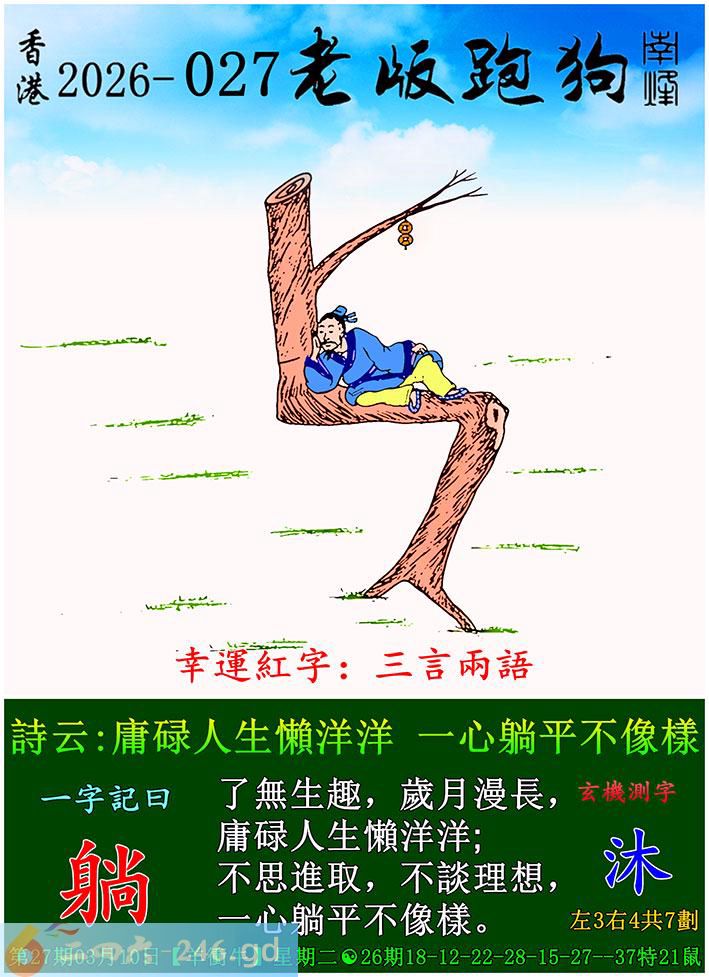 027期老版跑狗一字記之曰:【躺】 詩雲:庸碌人生懶洋洋,一心躺平不像樣。