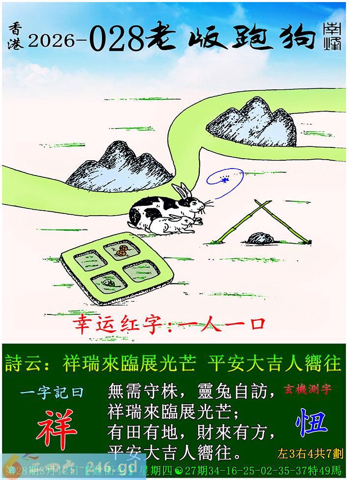 028期老版跑狗一字記之曰:【祥】 詩雲:祥瑞來臨展光芒,平安大吉人嚮往。 無需守株,靈兔自訪,祥瑞來臨展光芒; 有田有地,財來有方,平安大吉人嚮往。 玄機測字:《忸》