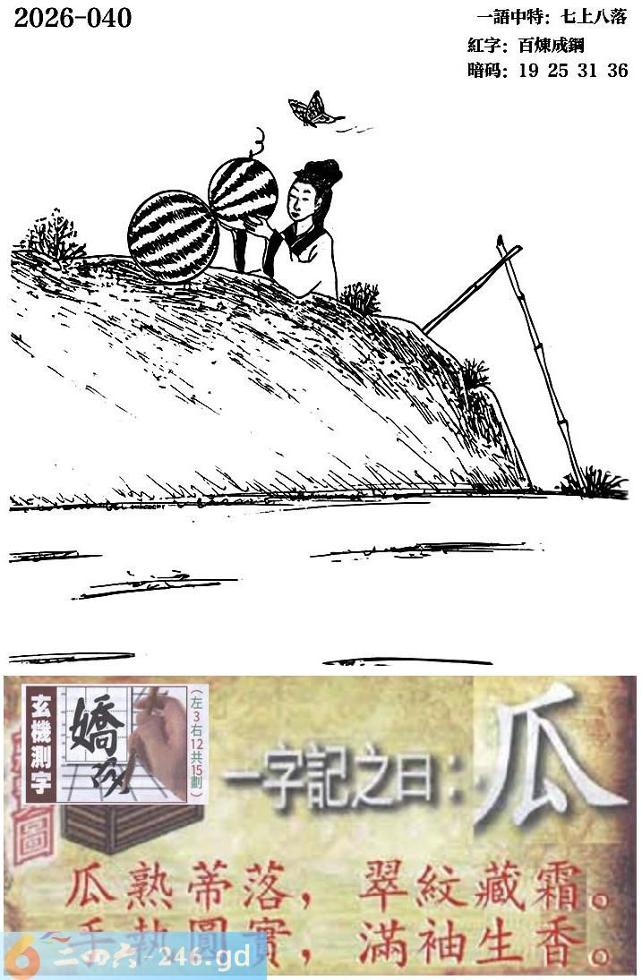 040期跑狗一字記之曰:【瓜】 瓜熟蒂落,翠紋藏霜。 手執圓實,滿袖生香。 玄機測字:《嬌》 一語中特:七上八落