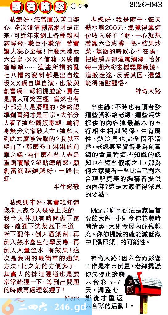 第043期讀者論談 1.貼總好,您曾屡次苦口婆心,多次澄清創富網才是正宗,可近年來網上各種雜料滿屏飛,數也不數清,著實讓人嗯心至極!什麼大陸版六合皇,子信箱,總信箱等等......這些所謂的亂七八糟的資料都是出自垃圾網自導自演,也敢與創富網三報相提並論,實在是讓人可笑至極!當然也有小部分人是清醒的,始終認準創富網才是正宗。大部分人看了這些翻版毒報,輸得身無分文家破人亡,這些人到底怎麼被洗腦的?我就不明白了,那麼多血淋淋的前車之鑑,為什麼有些人老是重蹈覆轍?望貼總解惑,願創富網越辦越好,一路長虹。半生緣敬 〖半生緣〗:不時也有讀者發這些資料給老總,這些網站提供的內容連最基本的五行相生相關係,生肖屬性,熱冷門也完全搞不清楚,老總甚至覺得身為創高網的會員對這些知識的認知也在這些假網之上,那為何大家要看一些比自己對六合理解更差的編稿者提供的內容?這是大家值得深思的要點。 2.貼總週末好,其實我知道您老人家今天是要上班的,我今天休息有時間做下家務,疏通下洗菜盆下水道,拆下配件,倒入通渠劑,再倒入熱水產生化學反應,再倒入大量溫水,有效果!這次是我用的最簡單的通渠方法,比之前的方便多了;其實人的排泄通道也是要常常疏通一下,等到出問題的時候再處理就遲了! 〖〗:廁水倒灌是家居首要的大敵,小則令你花费時間清潔,大則令屋內傢俬報廢。你的提議的確能減低家中「爆屎渠」的可能性。 3.老總好,我是廚子,每天薪水就200元,總覺得靠這份收入發不了財,一心就想著靠六合彩搏一把。結果炒菜、蒸飯的時候心不在焉,把廚房弄得煙霧漫,恰如每一期六彩玄機雲霧繚繞。這般迷途,反受其困,還望能得指點醒悟。神奇大路 〖神奇大路〗:因六合而影響工作是本末倒置,老總提議你先停止接觸六合彩3-7天,調整心熊後才重返六合彩的活動上。